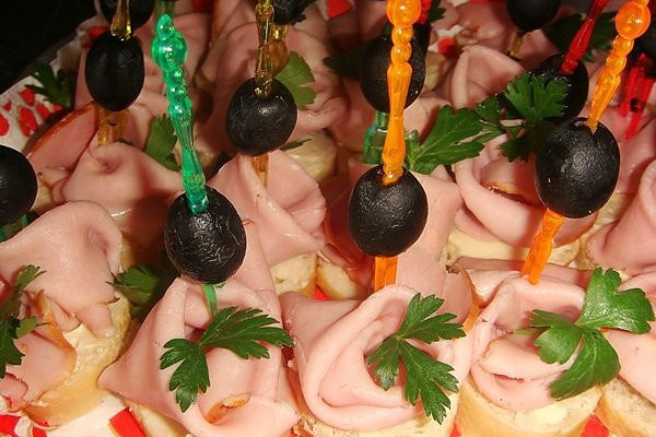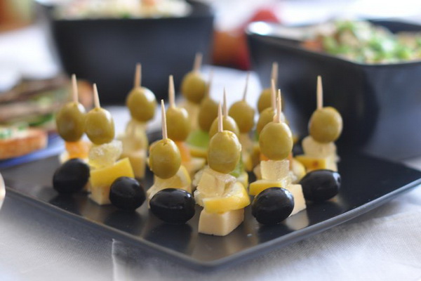3. Enfiler tous les ingrédients des canapés sur des brochettes multicolores dans cet ordre - fromage, olive, champignon, jambon.