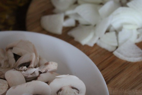 1. Couper les champignons en assiettes et les oignons en demi-anneaux.