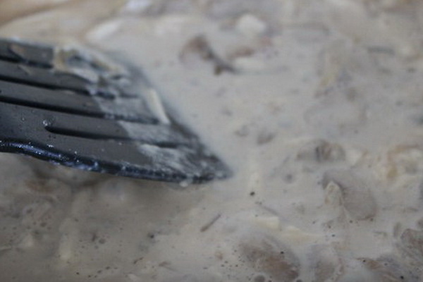 3. Ajouter la crème sure, mélangez bien avec les champignons frits.