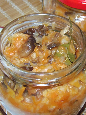 Pour commencer, faites tremper les champignons dans de l'eau potable pendant 3 heures à l'avance pour qu'ils gonflent. Après cela, égouttez le liquide dans lequel ils se trouvaient et remplissez-le de nouveau, laissez cuire pendant 30 minutes dans de l'eau à peine salée. Passer l'oignon coupé en rondelles dans l'huile pendant 5-6 minutes, puis ajouter le poivron et les champignons coupés en lanières. Après que la teinte dorée apparaisse, versez la tomate, ajoutez les câpres, les herbes, l'ail pilé, le chou finement haché, le sel et les dés de concombre. Un bocal de poisson avec du chou blanc et des champignons séchés est cuit au moins 40 minutes à feu doux pour que sa consistance soit uniforme et tendre.