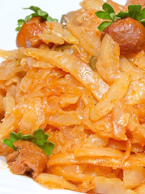 Épluchez les champignons et les oignons, coupez-les en cubes et passez-les dans l'huile pendant 15 minutes. Ajouter la pâte de tomates et laisser mijoter pendant 5 minutes. Ensuite, porter le bouillon à ébullition et y faire cuire le chou haché et le laisser passiver pendant 20 minutes. Verser les olives, les olives et les câpres dans des rondelles. Salez et poivrez et, quelques minutes avant la fin de la cuisson, ajoutez des tranches de citron.