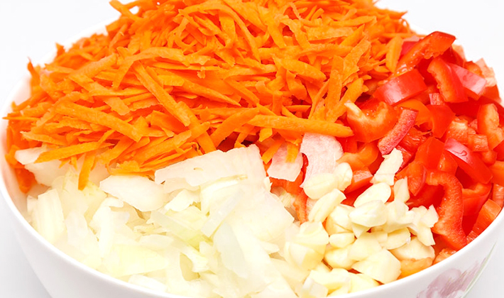 Il est nécessaire de hacher finement le chou, éplucher les champignons et couper en lamelles, le reste des légumes - en lanières.