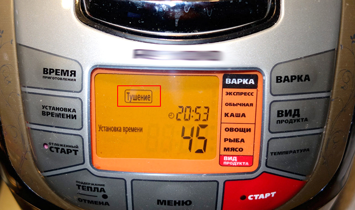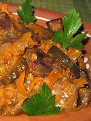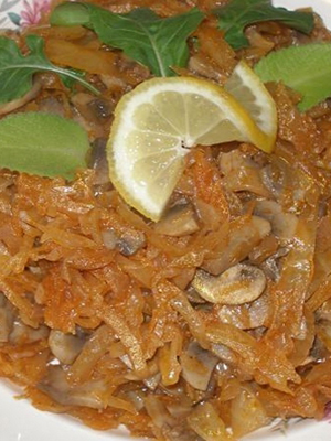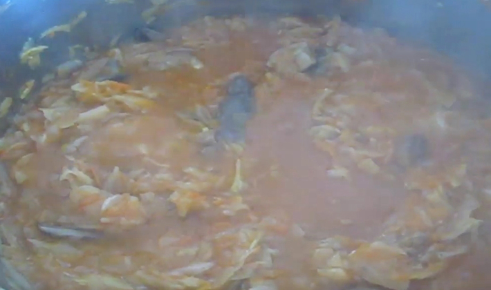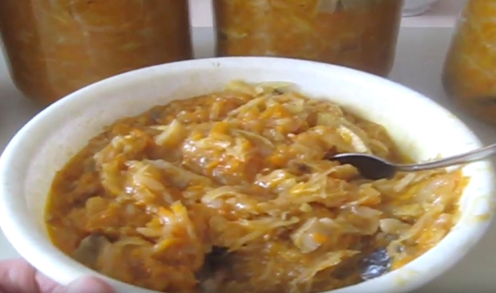 Coupez l'oignon en lanières, râpez les carottes pelées. Trancher le chou et les champignons. Faites frire les légumes dans un mélange d'huile jusqu'à tendreté. Mettez dans un bol de l'appareil et ajoutez le chou, l'ail haché, la pâte de tomate, le sel, le sucre et toutes les épices. Mélangez le tout et mettez le mode "Extinction", après environ une heure, les produits seront prêts. En attendant, traitez soigneusement les boîtes de conserve et les couvercles afin de les préserver pour un couple.
