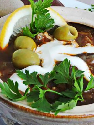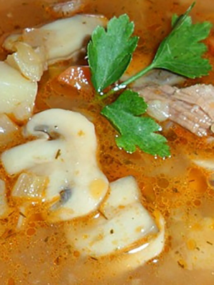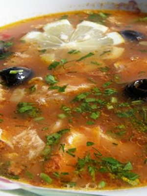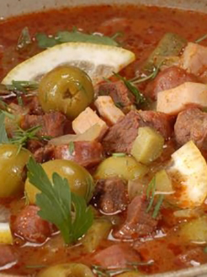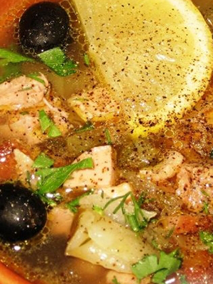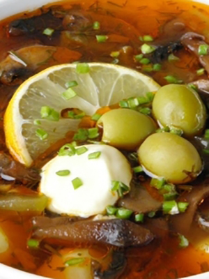 Couper tous les ingrédients de la viande en lanières ou en petits cubes. Oignons et concombres pelés et coupés en lanières. Broyez les olives en rondelles ou en tranches. Rincez, épluchez et coupez les champignons en tranches. Faire frire les oignons et les champignons jusqu'à ce qu'ils soient cuits. Pliez dans le fourré de l'appareil et versez dans le bouillon, en ajoutant les composants de la viande, les concombres, la pâte de tomate, le sel et les assaisonnements au goût. Remuer et laisser mijoter pendant 45 à 50 minutes. Au moment de servir, ajoutez des fines herbes et des olives fraîches.