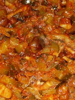 Faites frire tous les légumes dans une poêle jusqu'à ce qu'ils soient cuits, à l'exception des pommes de terre et des olives. Ensuite, mettez dans le fourré d'un appareil électroménager et versez-y le bouillon, ajoutez les grains de poivre, la feuille de laurier, une pincée de piment fort, le sel au goût et la pâte de tomate. Mélangez bien le tout et activez le mode trempe. Après 50 minutes, le plat est prêt au maximum d’une heure.