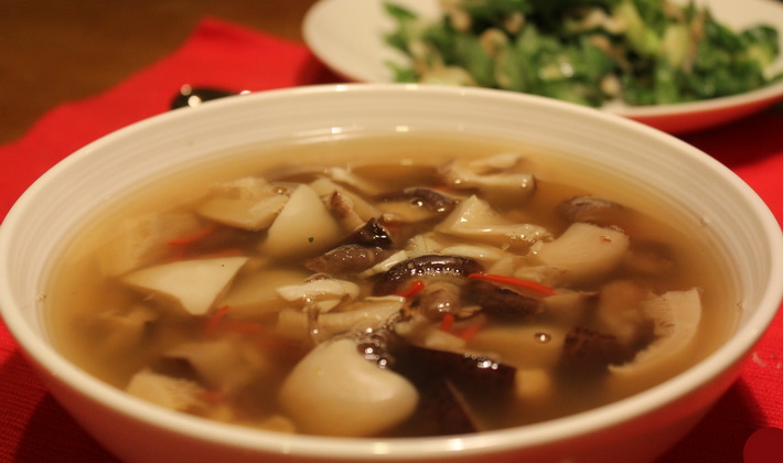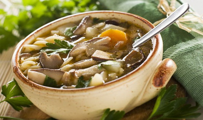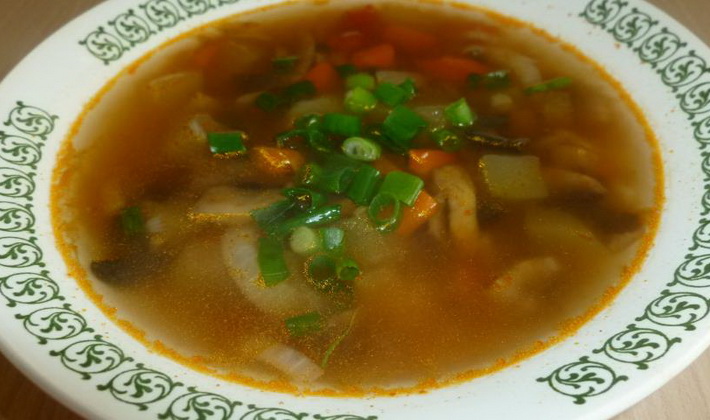 - Cuite selon cette recette soupe avec des champignons séchés et des pommes de terre parsemées d'herbes hachées.