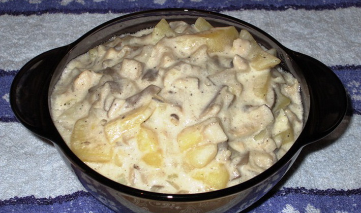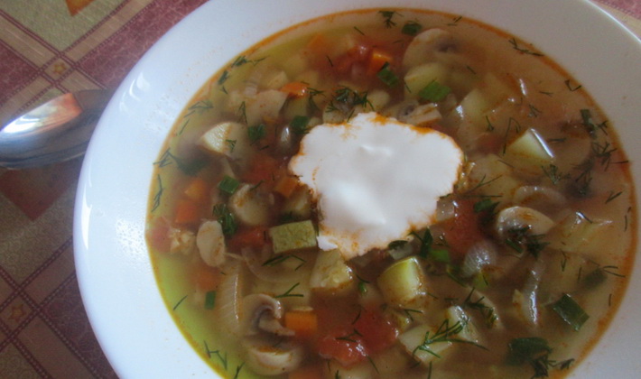 - Verser le lait dans le bouillon de champignons, saler, poivrer et bien mélanger. Les courgettes, les carottes, les pommes de terre, les oignons et les champignons hachés passent dans une casserole. Verser le bouillon de champignons laiteux, assaisonner de crème sure, saupoudrer de sel et de poivre, fermer le couvercle et mettre au four modérément chauffé pendant 20 minutes.