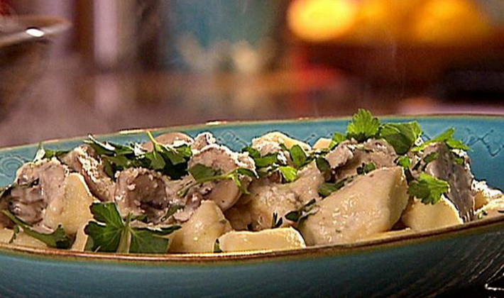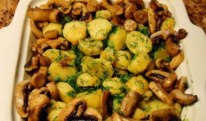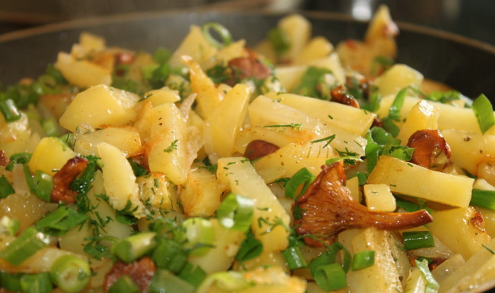 Au moment de servir des pommes de terre avec des champignons séchés, cuites dans une casserole, parsemer d'herbes finement hachées.