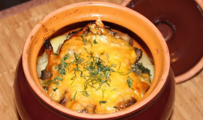 Préparez la sauce séparément. Mélanger la crème sure et le lait, saler, poivrer et ajouter la noix de muscade. Graissez les marmites avec du beurre, déposez-y des couches de pommes de terre et de champignons, versez chaque couche de sauce. Râpez le fromage sur une râpe grossière et saupoudrez la couche supérieure de pommes de terre dans chaque casserole. Préchauffez le four à 180 ° C et placez-y des casseroles pendant 2530 minutes. Vous pouvez vérifier l'état de préparation de la pomme de terre à l'aide d'une fourchette. La pomme de terre devrait devenir molle. Servir le plat directement dans des pots.