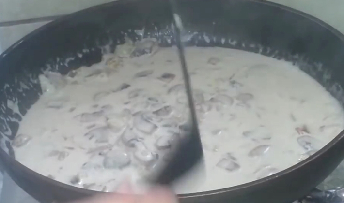- Ajoutez 150 g de crème grasse aux champignons, une gousse d’ail hachée, du sel, du poivre et d’autres épices, au goût. Laisser mijoter tous ces ingrédients pendant encore 2-3 minutes.