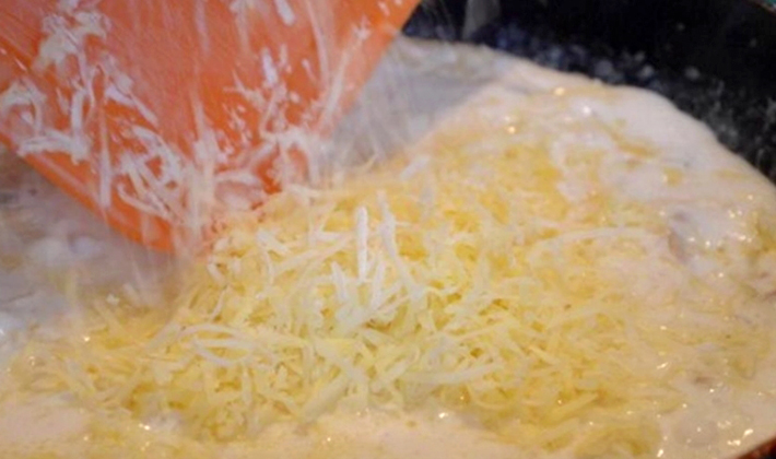 - Versez 150 g de fromage à pâte dure râpé, mélangez et laissez chauffer encore 5 minutes sous un couvercle fermé.