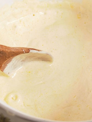 - Saupoudrer légèrement tous les ingrédients avec une cuillère à soupe de farine et versez 400 g de crème grasse, puis remuez rapidement pour obtenir une consistance homogène.