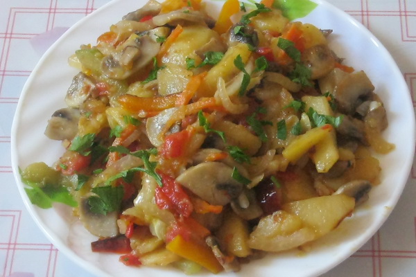 Faire revenir les oignons, les carottes dans l'huile végétale dans un autocuiseur, ajouter les légumes (frais, surgelés), les champignons, le ragoût, ajouter la sauce tomate, verser de l'eau et laisser mijoter jusqu'à cuisson complète.
