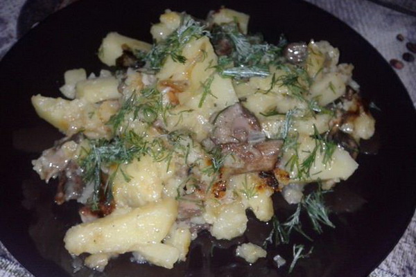 Faites bouillir les pommes de terre dans une pelure jusqu'à ce qu'elles soient tendres, refroidissez-les, épluchez-les, coupez-les en petits dés et faites-les frire dans l'huile, puis mettez les pommes de terre frites dans une casserole avec des champignons, versez sur le reste de l'huile, mélangez, saupoudrez de fromage râpé et faites cuire au four jusqu'à cuisson complète. Avant de servir, saupoudrer les pommes de terre de champignons au four et saupoudrer d'herbes fraîches.
