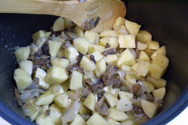 Avant de cuire les pommes de terre dans une mijoteuse, pelez-les et rincez-les bien. Faire bouillir pendant 25-30 minutes, égouttez l'eau. Verser avec de l'eau fraîche et cuire encore 15 minutes. Champignons finis coupés en petits morceaux. Peler les pommes de terre, les couper en dés, les oignons - en demi-anneaux. Versez l'huile dans le bol multicuiseur. Activez le mode “Préchauffer”, lorsque l'huile bout, placez les champignons et les oignons. Avec le couvercle ouvert, définissez le mode “Cuisson”. Ajoutez des pommes de terre aux champignons, salez, poivrez, ajoutez une demi-tasse d'eau pour cuire les pommes de terre. Activez le mode "Normal". Pour cuire des pommes de terre à l'étuvée avec des champignons dans une cocotte selon cette recette, laissez le couvercle ouvert pour que l'humidité s'évapore librement.