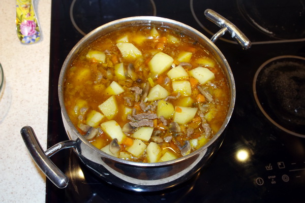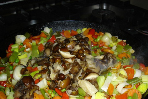 Rincez bien les champignons, coupez les en fines tranches et faites-les revenir avec les oignons émincés dans l'huile restante. Combiner tous les ingrédients et laisser mijoter dans une casserole, recouverte d'un couvercle, jusqu'à cuisson complète.