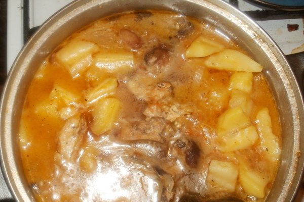 - Mettez le poulet et le poivre dans les pommes de terre, laissez mijoter pendant une demi-heure.