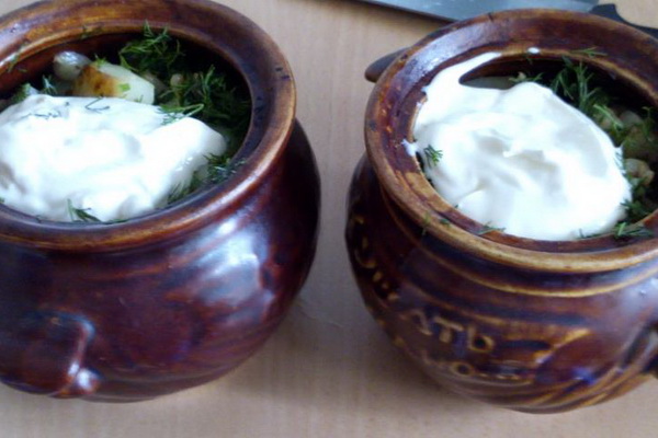 4. Ajouter un peu de crème sure dans chaque pot et mettre au four incomplètement, puis saupoudrer de persil finement haché. Mettez au four encore 5-7 minutes pour que les pommes de terre soient cuites dans de la crème sure.