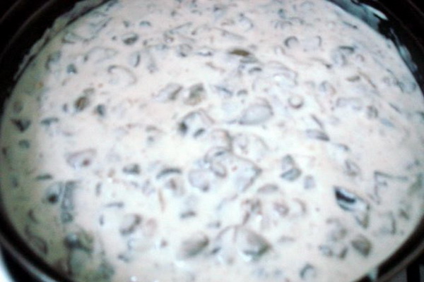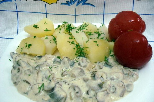 Mélanger les champignons et les légumes, saler, ajouter un mélange de poivrons moulus et assaisonner avec de la crème sure.