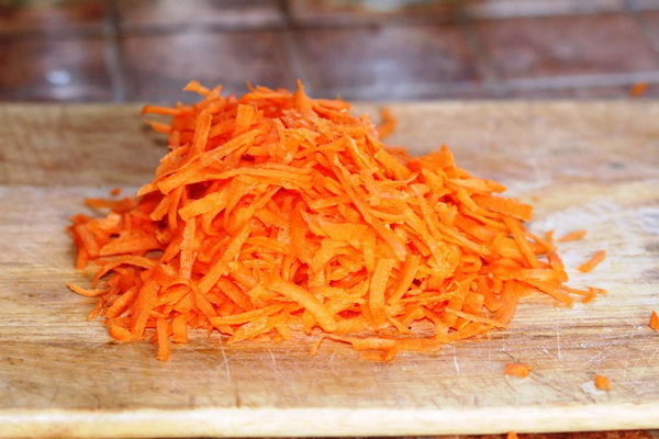 Râpez les carottes, faites les frire pendant 5 minutes et versez l'oignon coupé en rondelles dans le bol. Faire frire jusqu'à ce que le brun soit doré, en remuant continuellement.