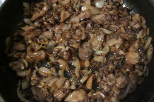 Ajoutez les champignons bouillis hachés à l'oignon et faites-les frire jusqu'à ce qu'ils soient dorés.