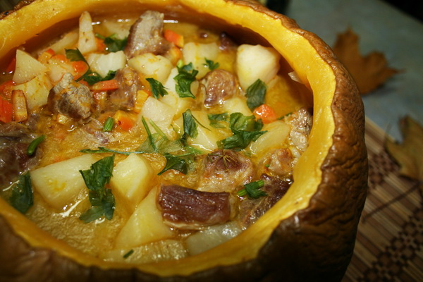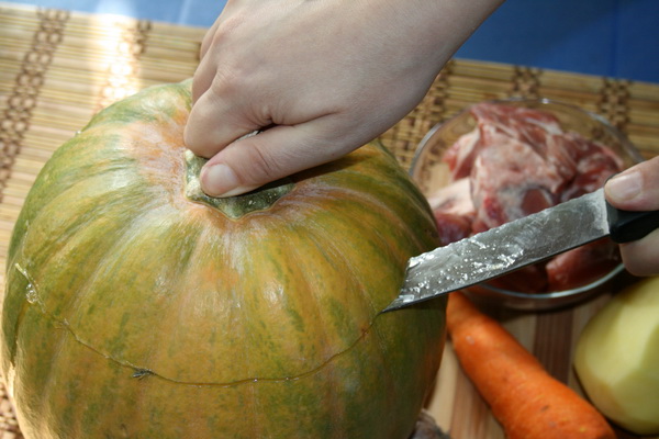 Le plat, dont la recette est donnée ci-dessous, est présent dans les cuisines de nombreux peuples du monde et dans les restaurants est servi avec un honneur particulier. Pour cuire une citrouille avec de la viande et des champignons au four, vous aurez besoin des ingrédients suivants: