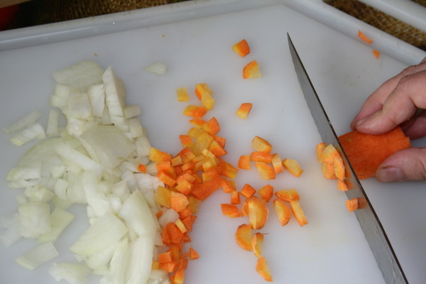 Lavez les carottes et les courgettes, épluchez-les, coupez-les en petits cubes, combinez-les avec la viande, les légumes et la pulpe cuite au four, mélangez bien.