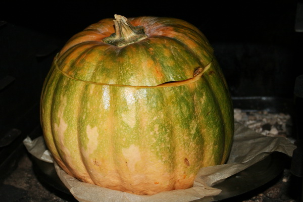 Placez la garniture dans la citrouille, fermez-la avec un “couvercle” et faites cuire au four encore 20 minutes.