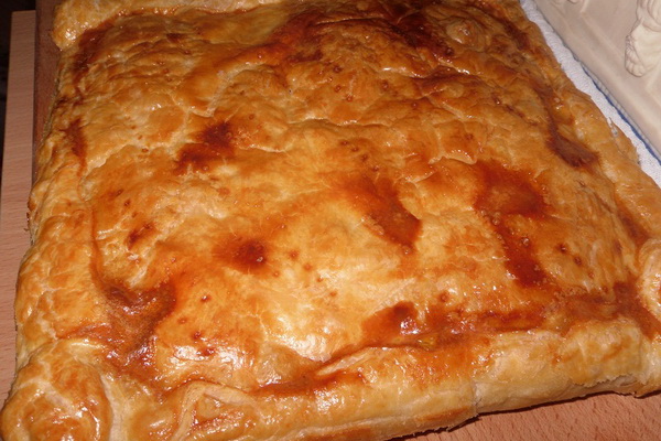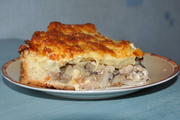 Préparez une recette pour une pâte feuilletée sans levure. Divisez la pâte finie en deux parties afin qu’une partie soit plus grosse que l’autre. Abaisser la majeure partie de la pâte en une couche de 2 à 3 mm d'épaisseur. Placez-le sur une plaque à pâtisserie arrosée d'eau froide. Les pommes de terre, pré-salées, poivrées, mettent la pâte. Mettez le fromage et les champignons sur les pommes de terre, ajoutez les oignons frits, les herbes hachées, salez et poivrez au goût. Abaisser la plus petite partie de la pâte en une couche, la recouvrir de la garniture et pincer les bords de la pâte. Mettre à l'épreuve pendant 20 minutes. Ensuite, faites cuire au four pendant 40 minutes.