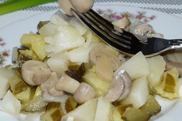 Couper et faire revenir l'oignon, y ajouter les haricots et les champignons, cuire jusqu'à ce que le liquide disparaisse. Faire bouillir les pommes de terre, les peler et les couper en cubes. Ajouter les pommes de terre bouillies aux champignons avec les oignons. Cool, assaisonner avec de la mayonnaise.