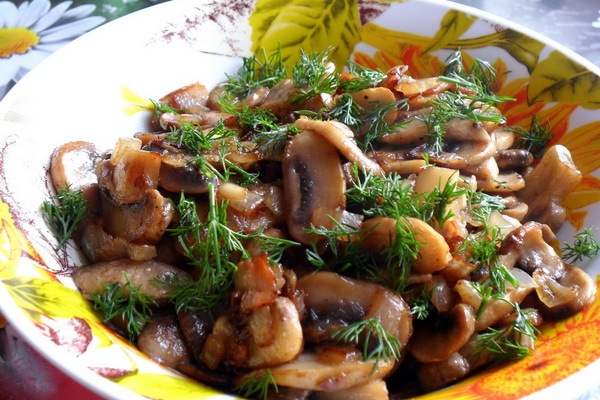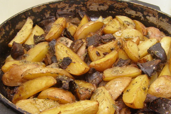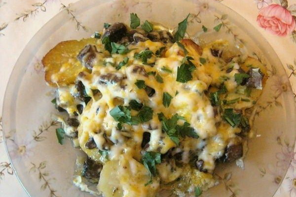 Des chênes vert olive pelés et lavés et des chênes mouchetés coupés en petits morceaux, un ragoût à l'huile avec des oignons et une pincée de graines de cumin. Couper les pommes de terre bouillies, les mélanger avec les champignons cuits, verser le lait et cuire au four. Servir les pommes de terre bouillies avec les champignons cuits selon cette recette, saupoudrés d'herbes.