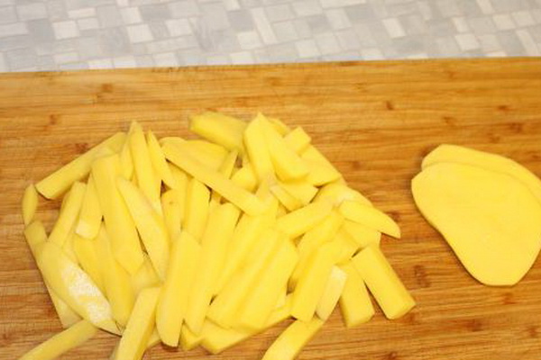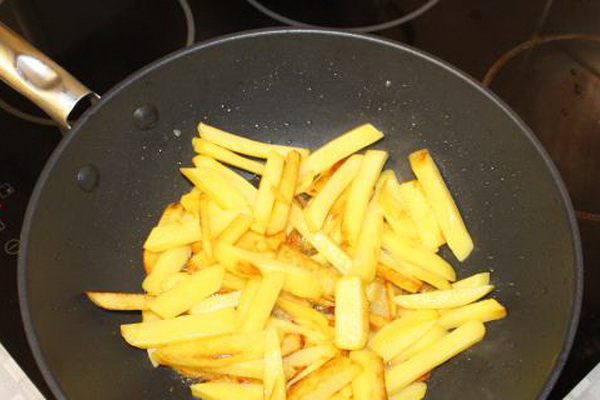 Pelez les pommes de terre, coupez-les en lanières et faites-les frire dans l'huile jusqu'à la cuisson à moitié.