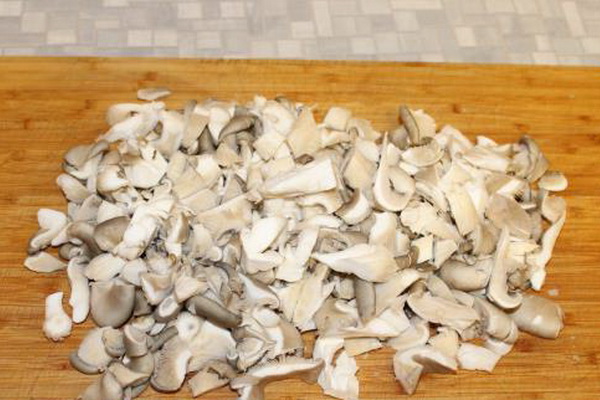Les pleurotes sont essuyés avec une éponge humide, coupés en morceaux et coupés à la pièce.