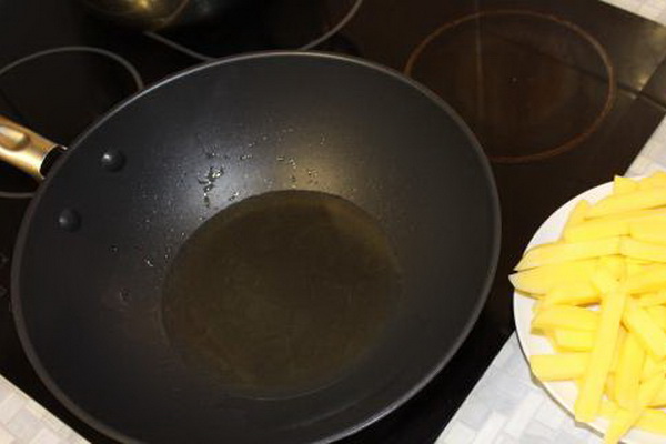 Dans une casserole, faites chauffer l'huile végétale et mettez les pommes de terre coupées en fines tranches. Immédiatement, n'intervenez pas, mais attendez qu'elle prenne un peu de croûte.