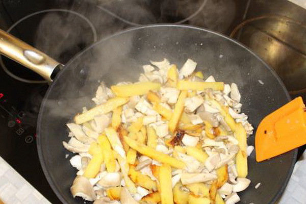 Le feu sur le poêle doit être fort pour pouvoir soulever le plat avec une spatule en bois et le retourner. Ces actions ne doivent pas être effectuées plus de 3 fois afin que les pommes de terre contenant des pleurotes ne se transforment pas en bouillie.