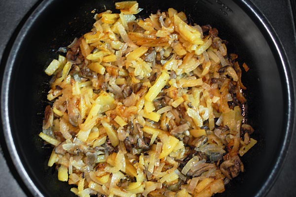 Ajoutez à l'oignon et faites frire pendant 10 minutes. Si beaucoup d'eau est libérée, ne vous inquiétez pas, les pommes de terre seront saturées par l'arôme des champignons.