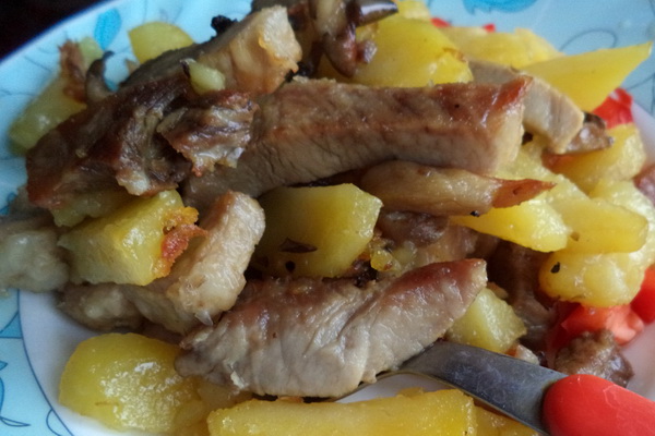 Comment faire frire les pleurotes avec des pommes de terre et du porc: recette avec photo