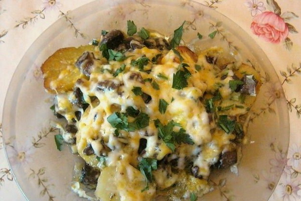 Fermez les champignons avec la seconde moitié des pommes de terre, saupoudrez de fromage à pâte dure râpé sur une râpe grossière et mettez au four.