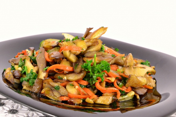 Les pleurotes coupés en morceaux de forme arbitraire et les faire frire dans une poêle avec de l'huile végétale jusqu'à ce qu'ils soient dorés.