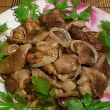 Tout d'abord, vous devez faire bouillir le foie et faire bouillir séparément les cœurs avec le nombril. Le liquide dans lequel les abats ont été bouillis peut être laissé sous forme de bouillon, mais il devrait être refroidi.