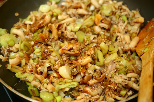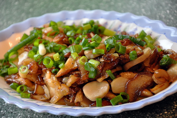 - Champignons frits aux oignons verts et aux noix