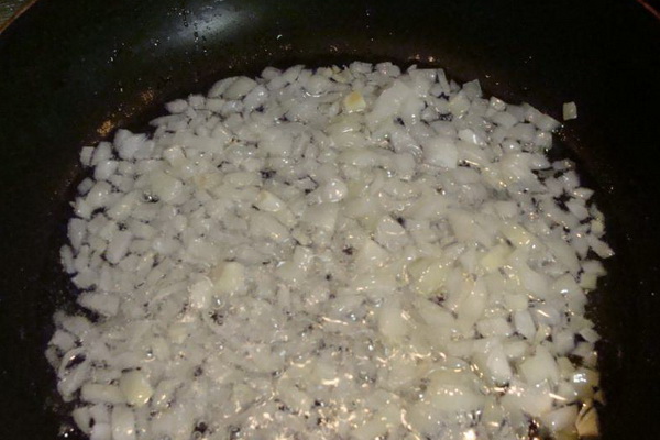 Épluchez et hachez l'oignon en demi-rondelles et faites-le frire dans l'huile jusqu'à ce qu'il soit à moitié cuit.
