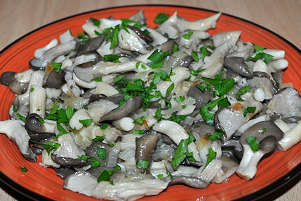 Les champignons d'huîtres coupés en petits morceaux et faire bouillir pendant 10 minutes. Ensuite, mettez dans une poêle chaude et faites légèrement frire jusqu'à ce que le liquide attribué s'évapore.