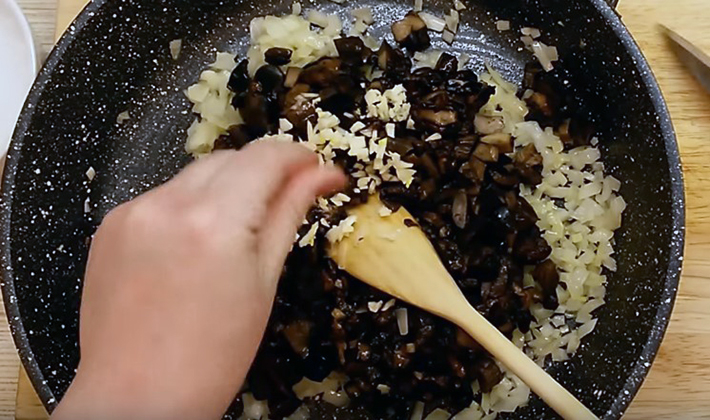 - Cuire le remplissage. Champignons (si très salés, rincer légèrement, presser), les couper en lanières et les faire frire dans de l'huile végétale. Frire les oignons hachés séparément. Mélanger les champignons et les oignons, assaisonner de poivre.