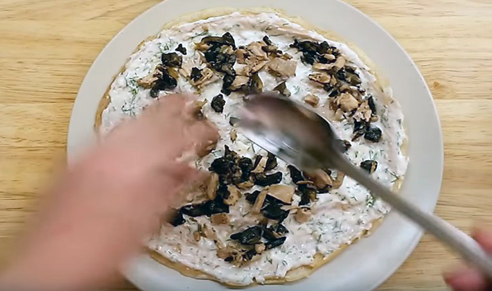 - Sur la pâte, dans une plaque à pâtisserie, mettre la garniture de champignons sautés à l'huile végétale, mélangée à des oignons frits séparément jusqu'à coloration dorée, saler et poivrer.