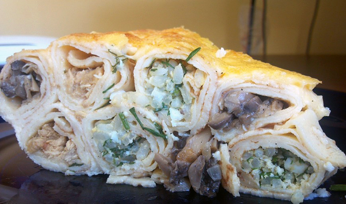 Graisser les crêpes avec la garniture aux champignons, les empiler au réfrigérateur et les réfrigérer pendant 30 minutes.