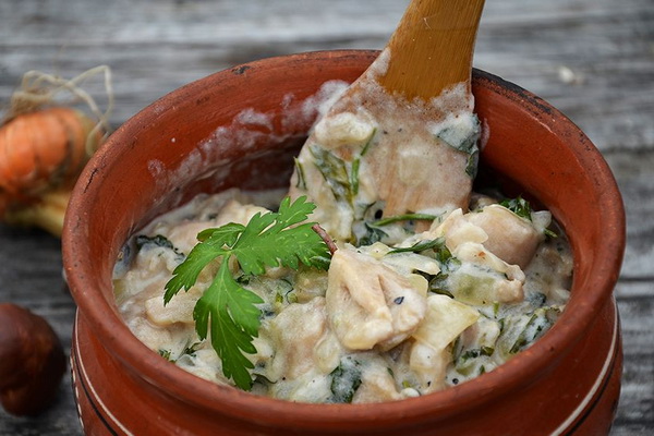 Éplucher le tubercule de pomme de terre, faire bouillir dans de l'eau salée pendant 30 minutes. Purée dans une purée de pommes de terre avec une petite quantité de bouillon, du beurre, du vinaigre balsamique et de l'ail pelé et haché. Diluer la purée avec le bouillon restant à l'état de crème sure liquide.