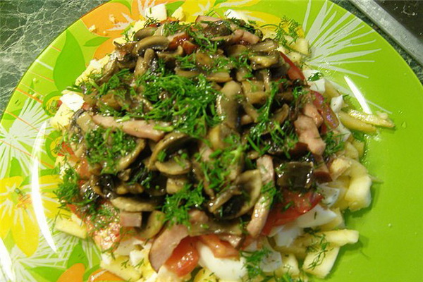 Mettez les pommes, les tomates, les œufs et les champignons dans un bol à salade en verre ou en portions, en versant la sauce périodiquement. Au moment de servir, cuit selon cette recette salade de champignons de champignons garnir d'aneth.