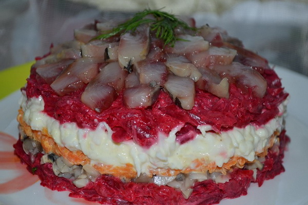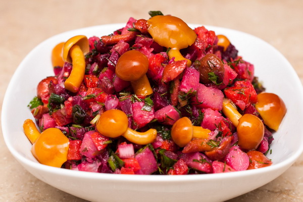 Avant de faire cuire une telle salade de champignons, il faut faire bouillir les pommes de terre, les carottes et les betteraves. Ensuite, épluchez, coupez en cubes ou en tranches, mélangez avec les cornichons, versez la vinaigrette ou la crème sure, mélangez le tout, mettez dans un bol à salade, saupoudrez d'oignon vert.
