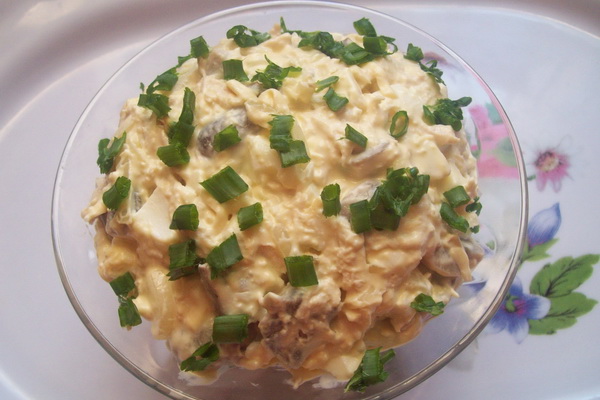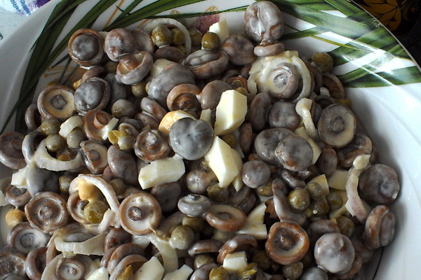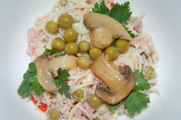 Couper les champignons, les oignons, ajouter les pois verts et les pommes de terre à l'eau. La salade de champignons préparée selon cette recette simple doit être assaisonnée de mayonnaise.